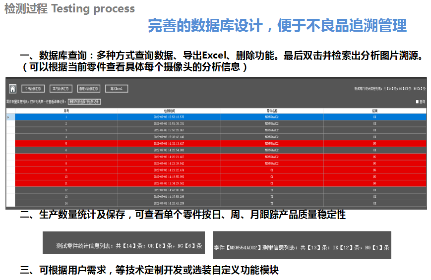 3、檢測零件統(tǒng)計數(shù)據(jù)可查詢、導(dǎo)出Excel;